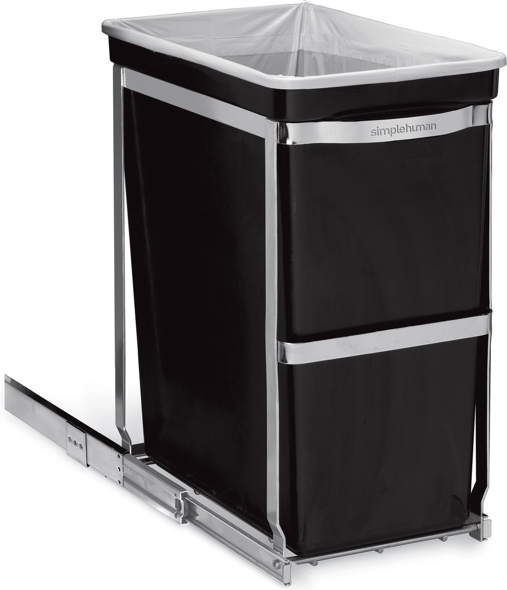 Afvalemmer Inbouw Pull Out van Simplehuman, met een inhoud van 30 liter. Deze uitschuifbare afvalemmer kan in veel keukenkastjes worden ingebouwd. Deze prullenbak werkt met behulp van een stalen contructie die in het keukenkastje gemonteerd dient te worden. Dankzij het uittrekmechanisme kan de prullenbak eenvoudig in en uit het keukenkastje worden geschoven. De prullenbak is voorzien van een hendel waardoor het in- en uitschuiven zeer gemakkelijk gaat. De prullenbak heeft een ruime inhoud van 30 liter en is geschikt voor afvalzakken met code K.