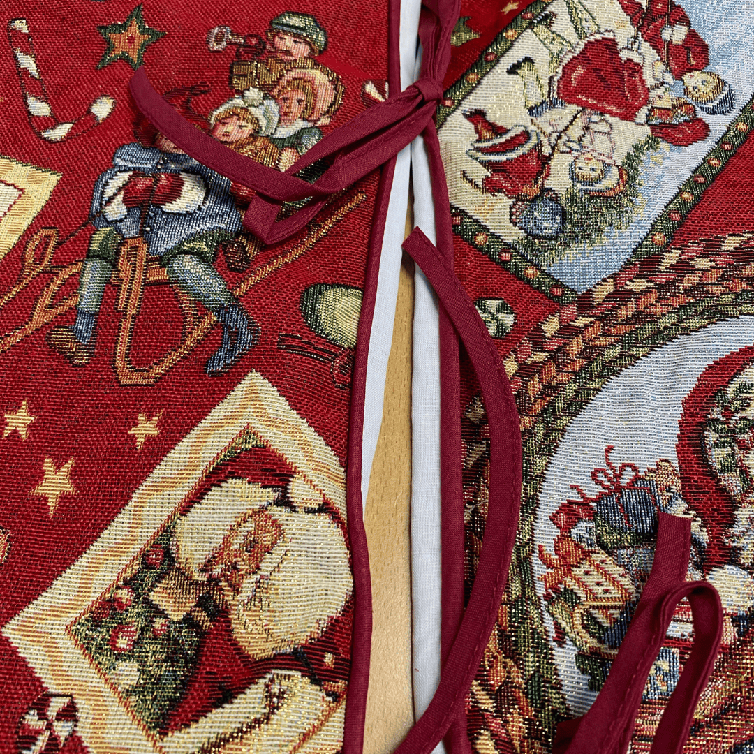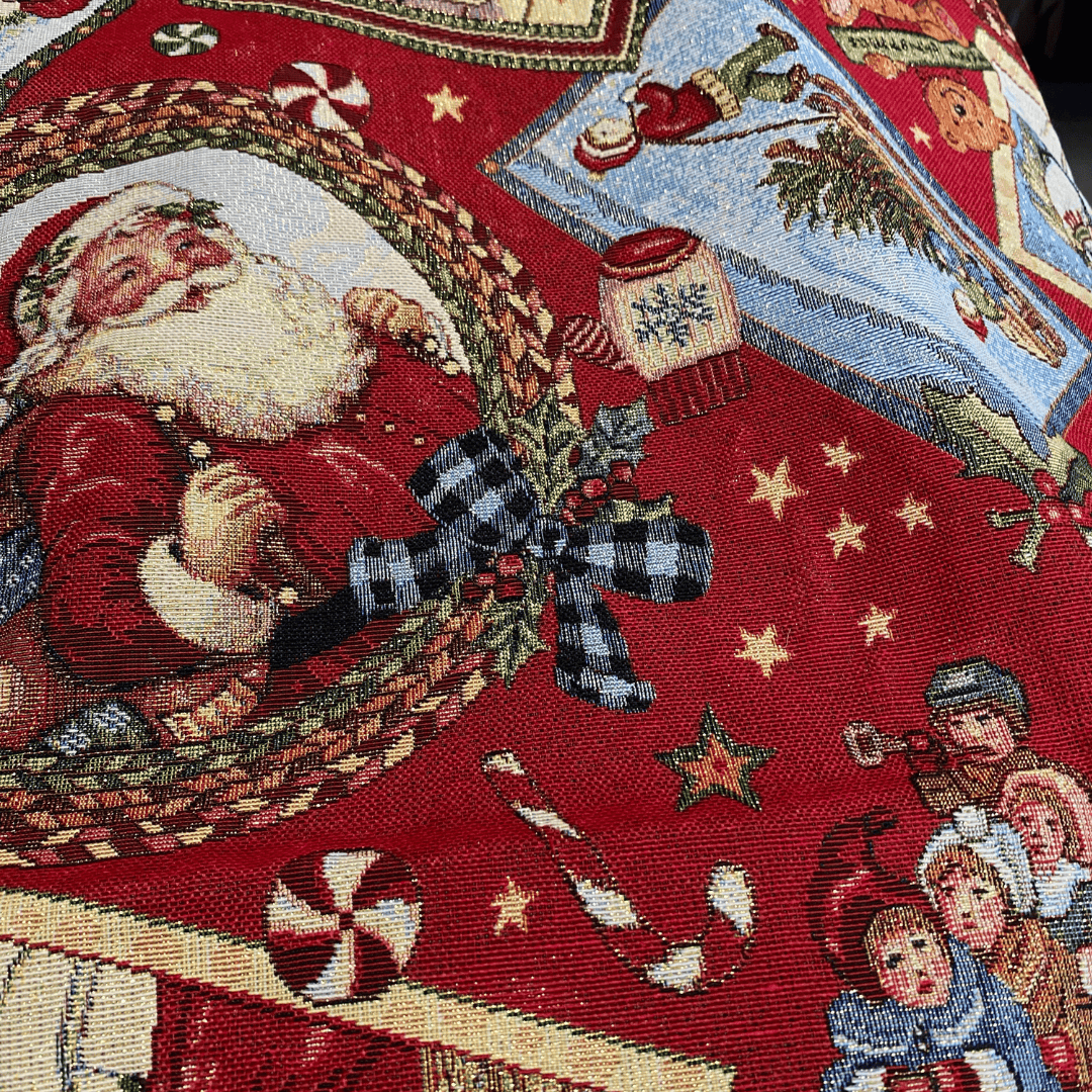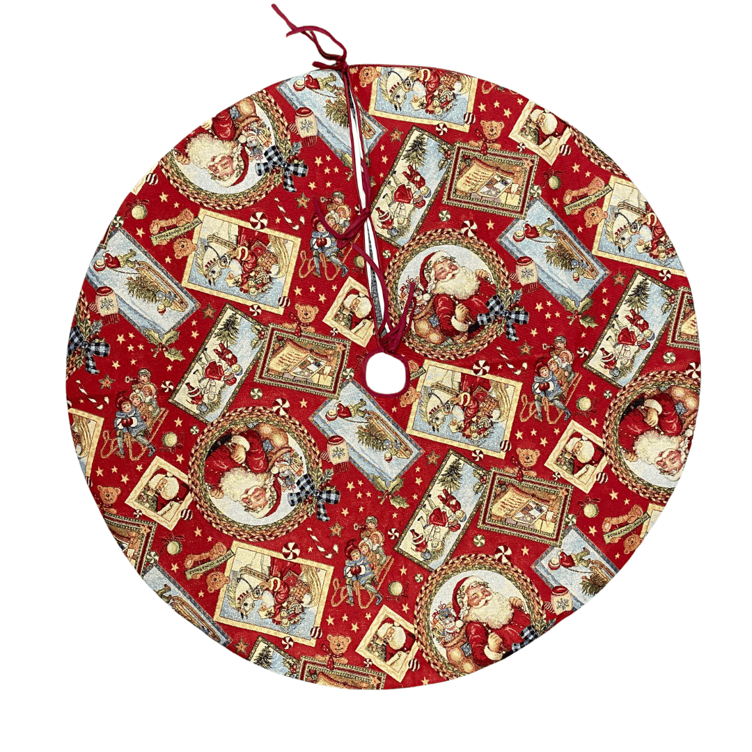 Maak van je kerstboom het stralende middelpunt van de kamer met deze betoverende boomrok! Deze prachtige treeskirt van luxe gobelinstof toont een sfeervol kersttafereel met rode achtergrond en kerstmannen. Het subtiel verweven goudkleurige glitterdraad geeft een feestelijke glans en brengt direct warmte en magie in huis.