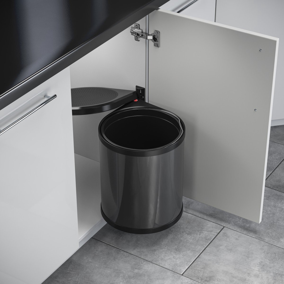 Deze inbouw-afvalemmer is ontworpen voor keukenkastjes met een draaideur van minimaal 40 cm breedte (en geschikt tot 90 cm), en vereist slechts een minimale kastdiepte van 30,5 cm. Dankzij de slimme swing-installatie opent de afvalemmer automatisch mee met de kastdeur.