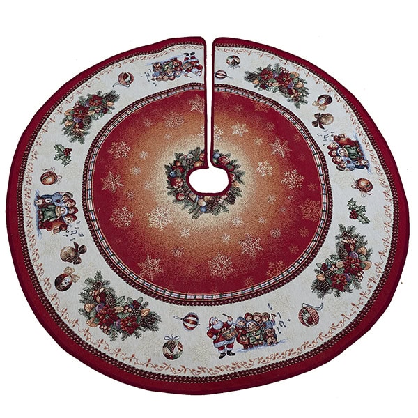 Maak je kerstboom compleet met deze sfeervolle kerstboomrok van gobelinstof, rijk versierd met klassieke kerstmotieven. De print toont een warme scène met de Kerstman en een zingend kinderkoor, omringd door kerstroos, hulsttakken en kerstballen op een dieprode achtergrond.