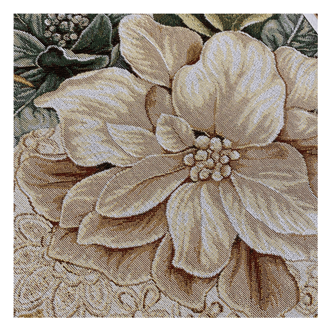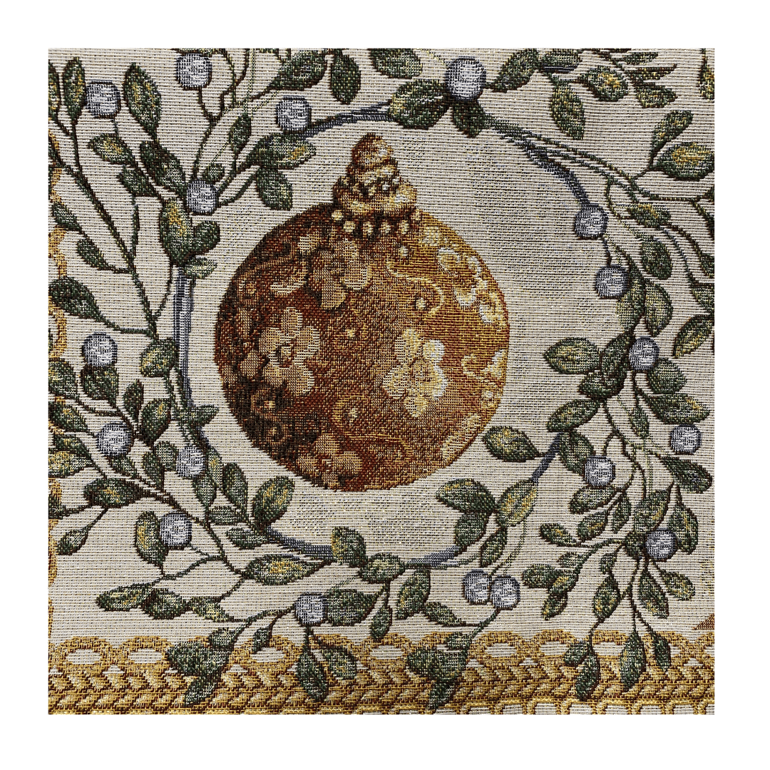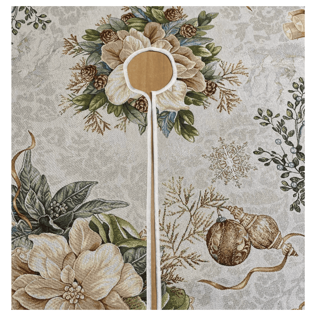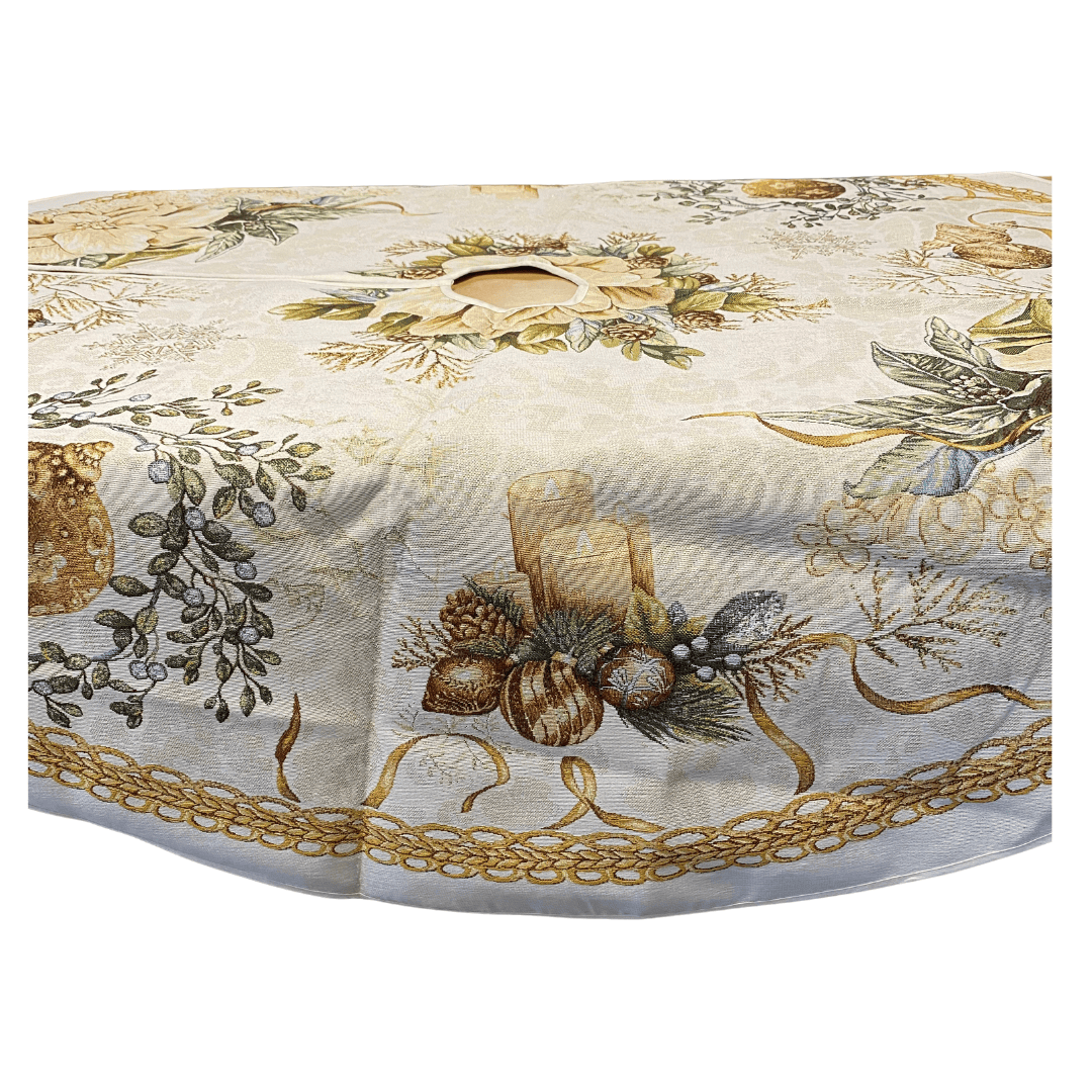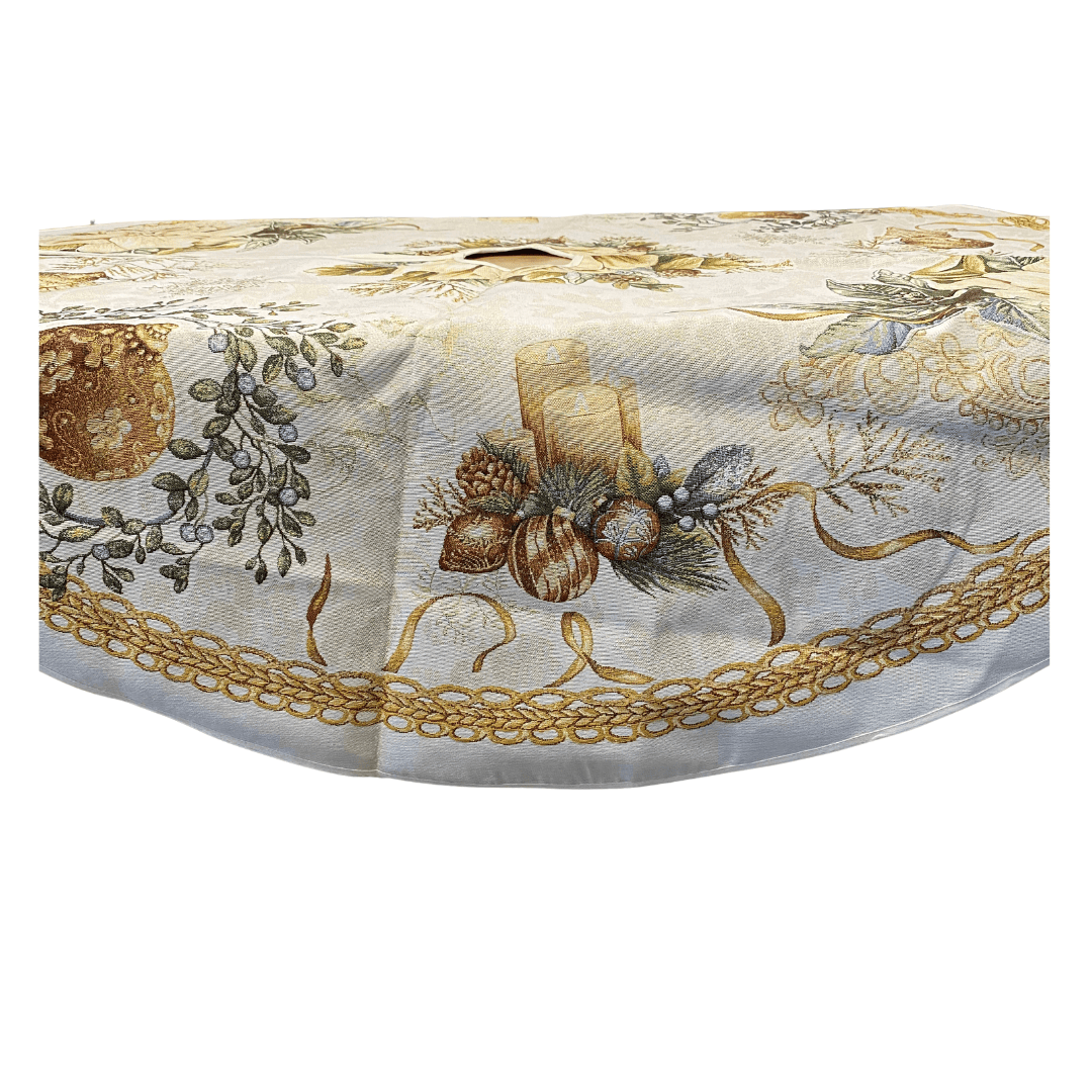 Geef je kerstboom een elegante finishing touch met deze sfeervolle kerstboomrok van luxe gobelinstof. De rijke crèmekleur vormt een prachtig canvas voor klassieke kerstmotieven zoals kerstrozen, kaarsen, maretak (mistletoe) en feestelijke kerstballen – alles stijlvol doorweven met subtiel goud glitterdraad voor een vleugje kerstmagie. ✨