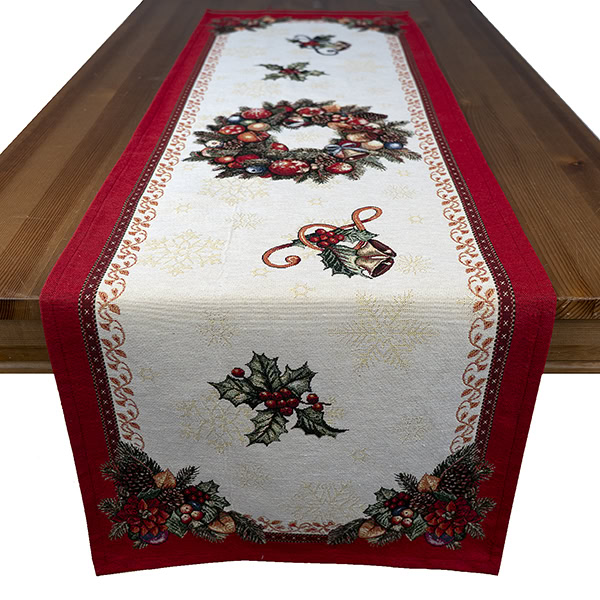 Kersttafelloper – Gobelinstof – Rood met Kerstman en koor – Hulst – kerstballen en kerstrozen – 45 x 140 cm