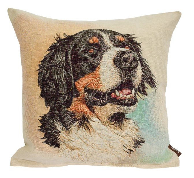 Met dit kwalitatief hoogwaardige kussenhoes van gobelinstof creëert u snel een vrolijke woonkamer. De uitstraling is romantisch en tijdloos tegelijk. Op de afbeelding ziet u een Berner Sennen.