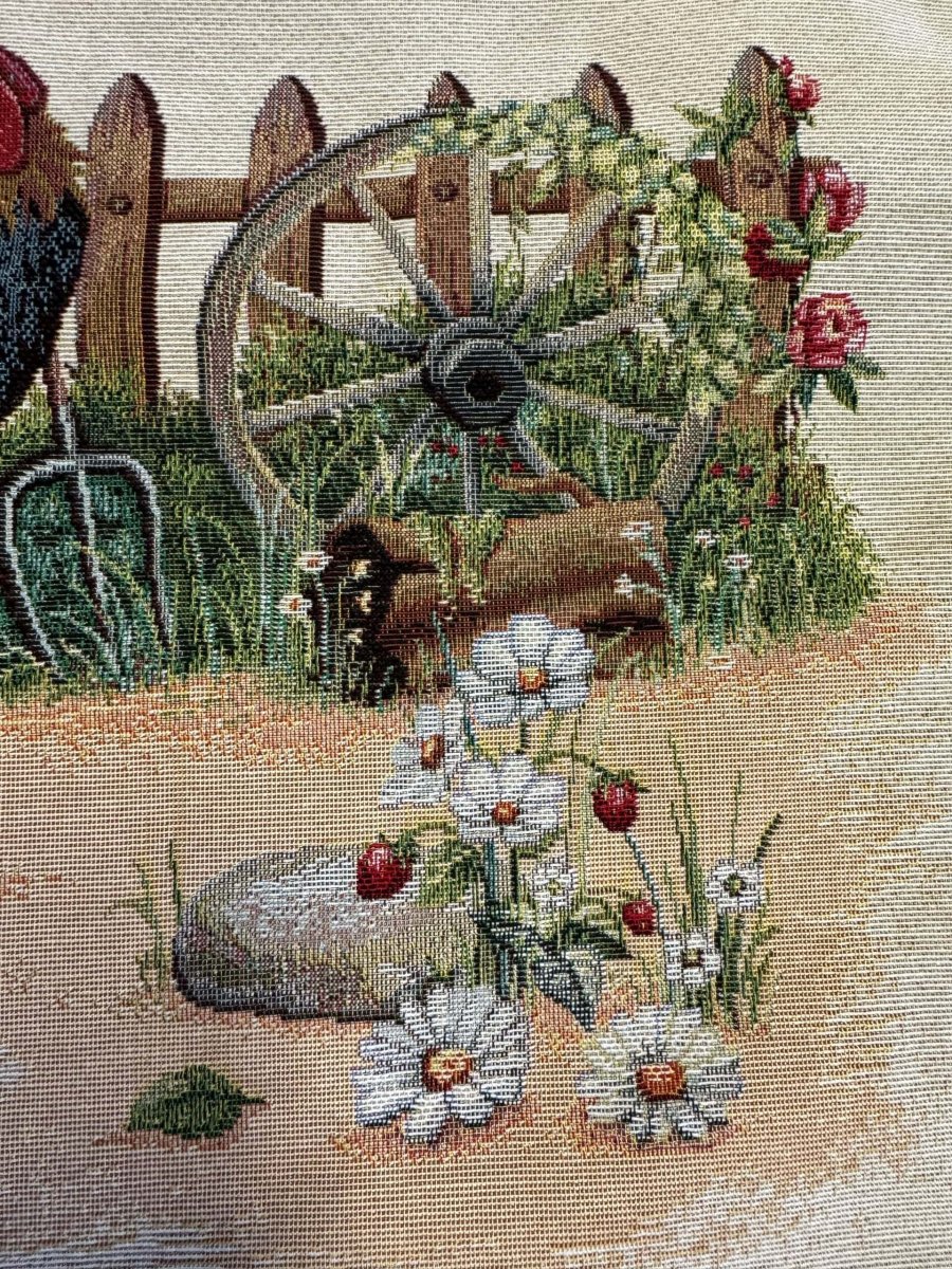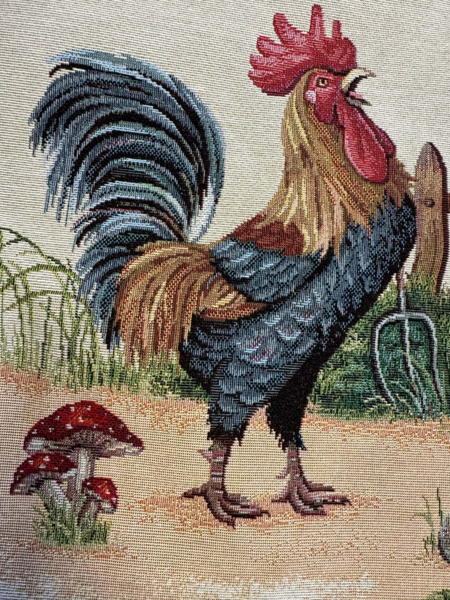 De rijke gobelinstof met haanmotief maakt deze hoes een echte blikvanger in elke kamer – van woonkamer tot keuken of serre.