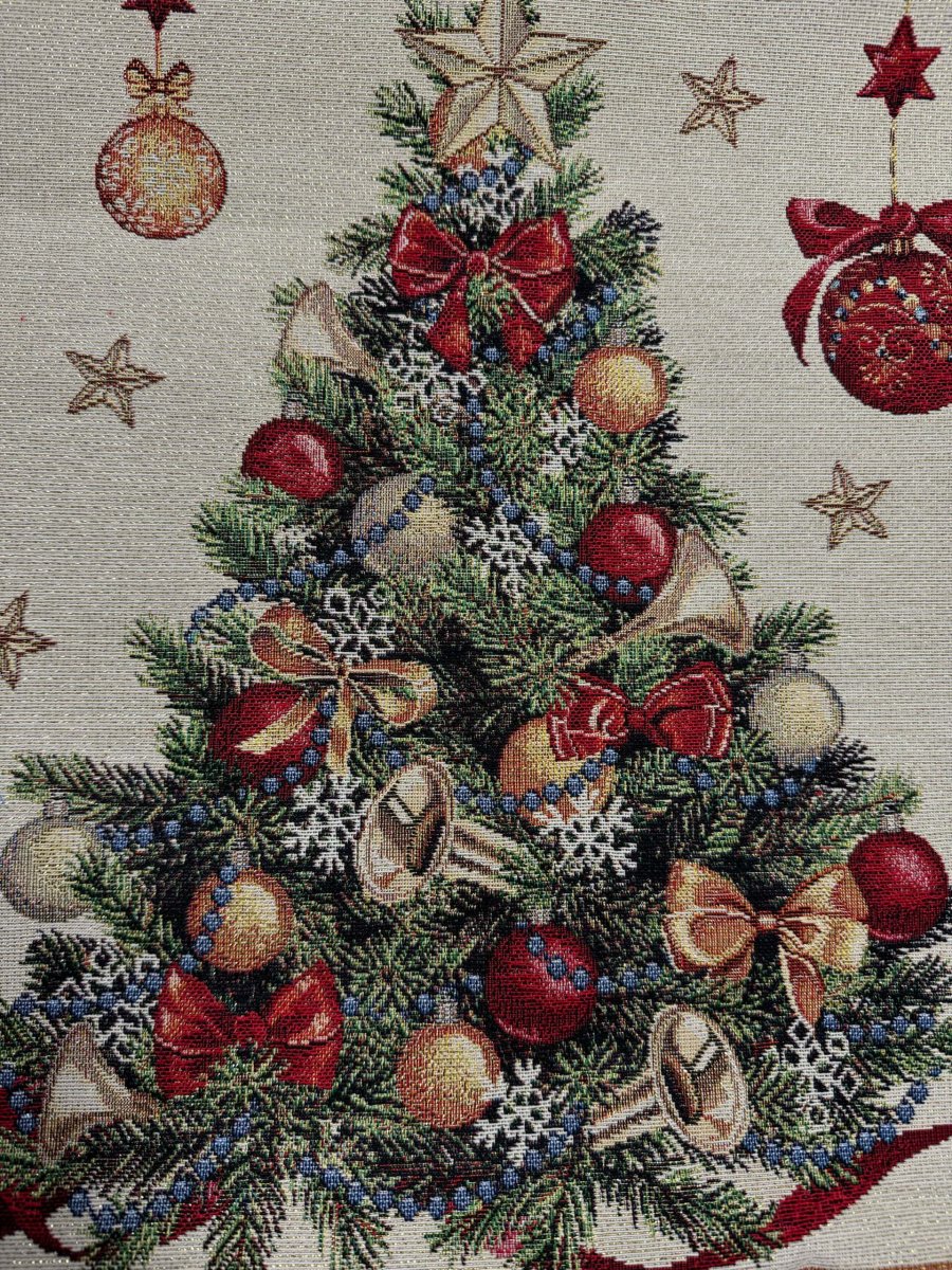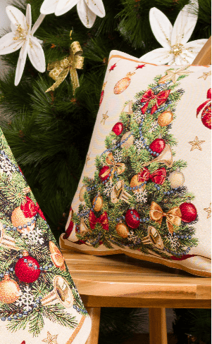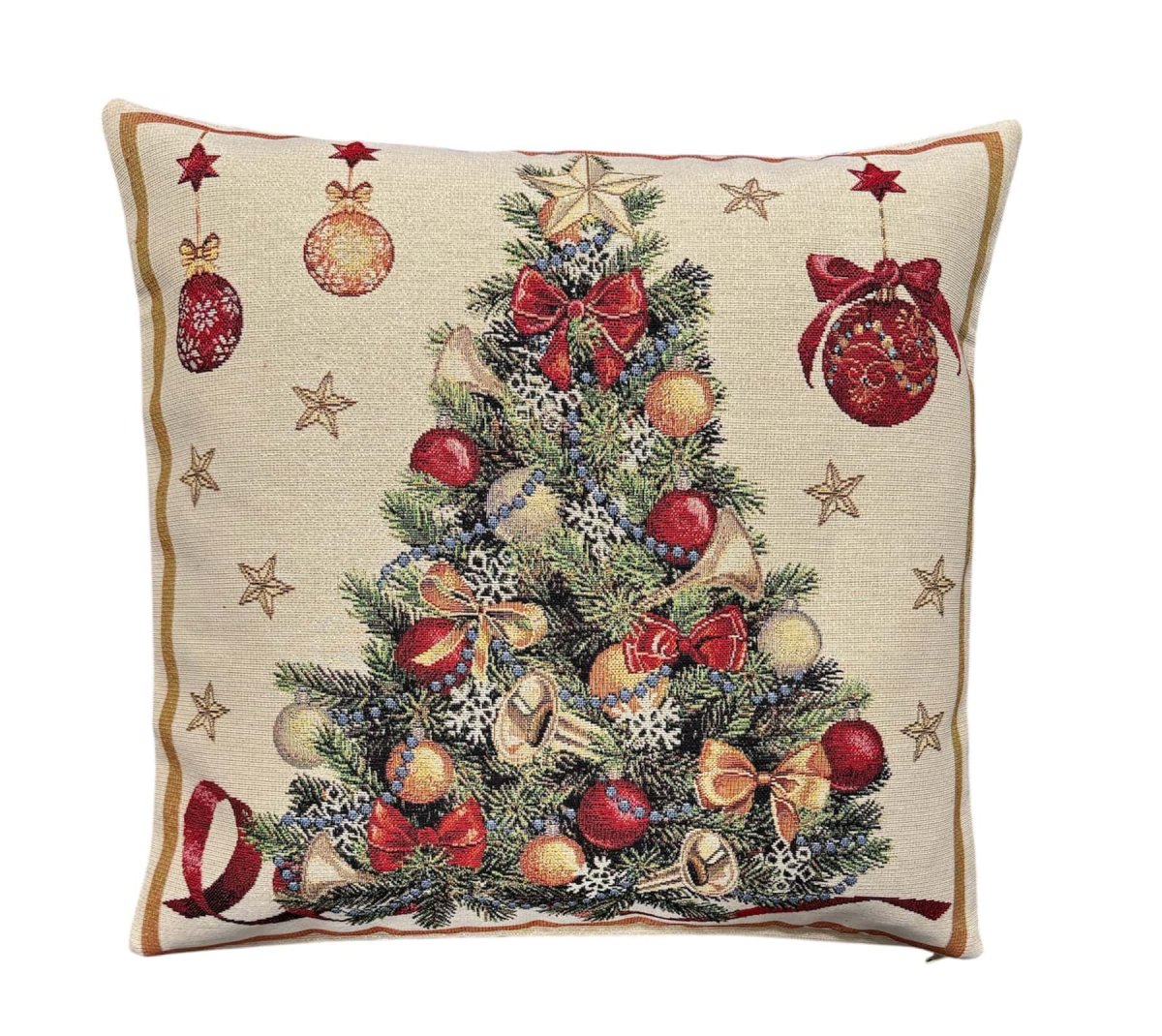 Met dit kwalitatief hoogwaardige kussenhoes van gobelinstof creëert u snel een vrolijke woonkamer. De uitstraling is romantisch en tijdloos tegelijk. Op de afbeelding ziet u een kerstboom met kerstballen en strikken.