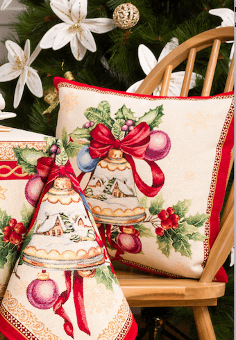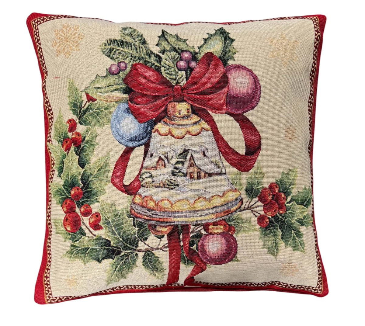 Kussenhoes – luxe Gobelinstof – Kerst – Ivy – Kerstballen – Strikken – Bel – Hulst – 45 cm