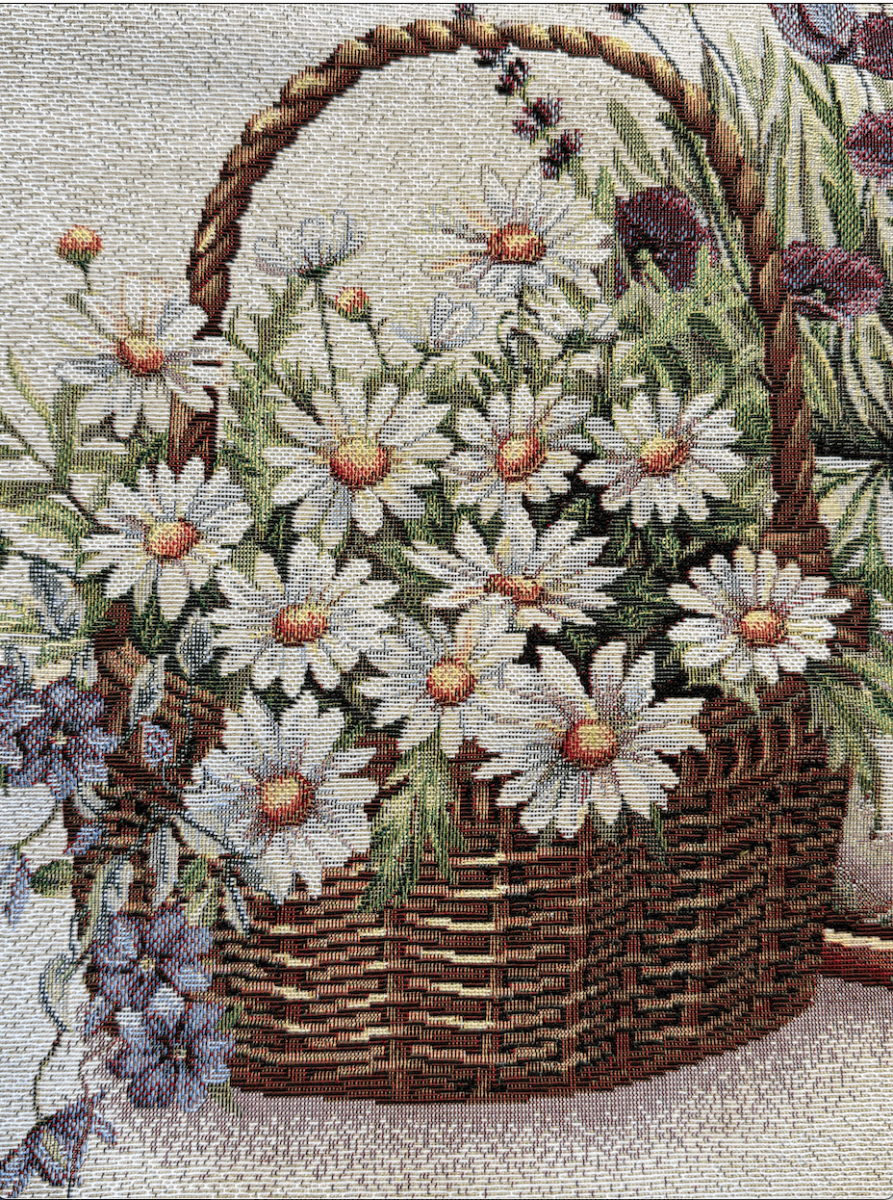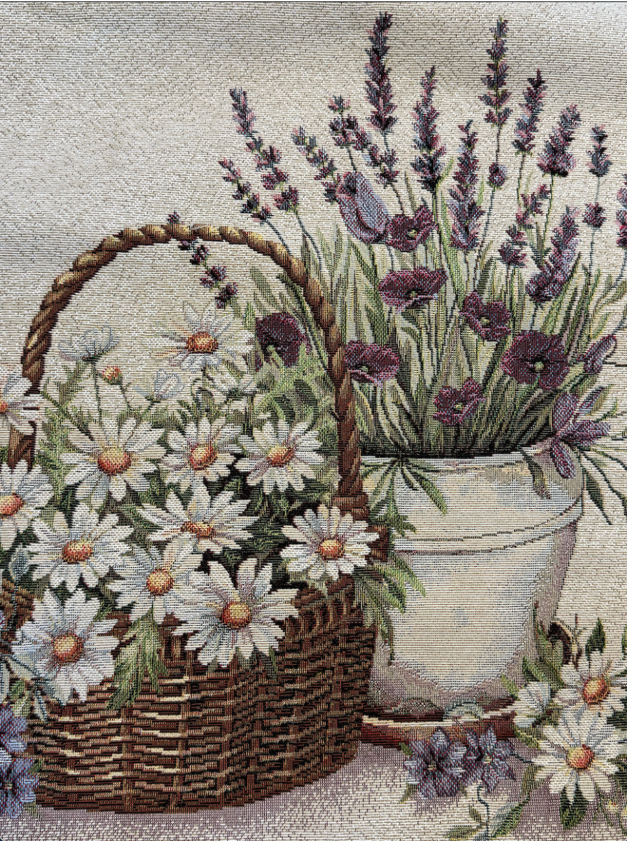 Geef elk interieur een frisse, landelijke uitstraling met deze decoratieve kussenhoes met margrieten en lavendel, vervaardigd uit luxe gobelinstof. De combinatie van witte margrieten en paarse lavendel straalt rust, natuur en zomerse elegantie uit – perfect voor een stijlvol en tijdloos woondecor.