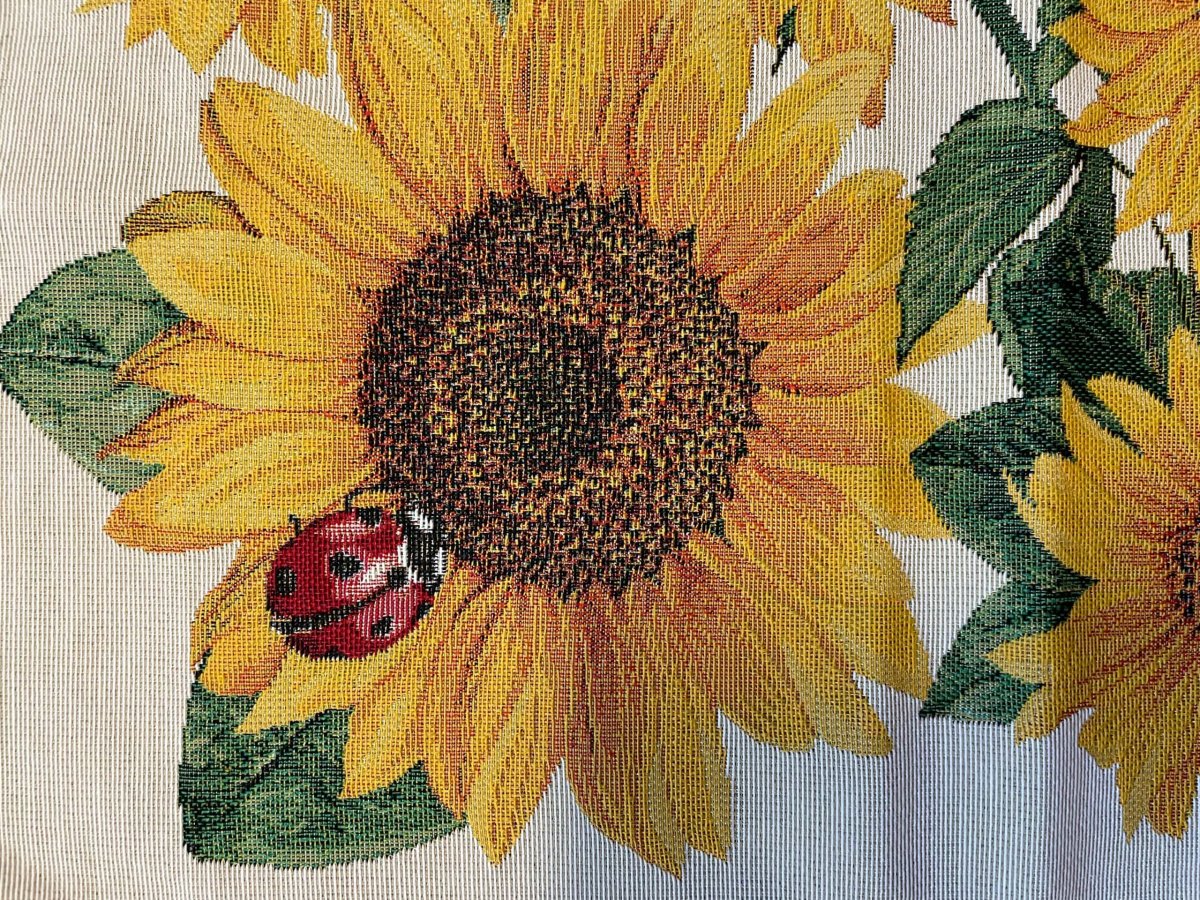 De uitstraling is modern, romantisch en tijdloos tegelijk. Dit design met prachtige grote zonnebloemen is ook verkrijgbaar in tafelkleden, lopers en placemats.