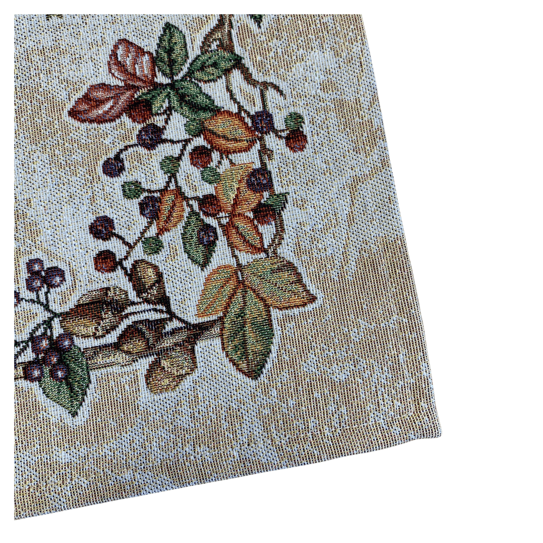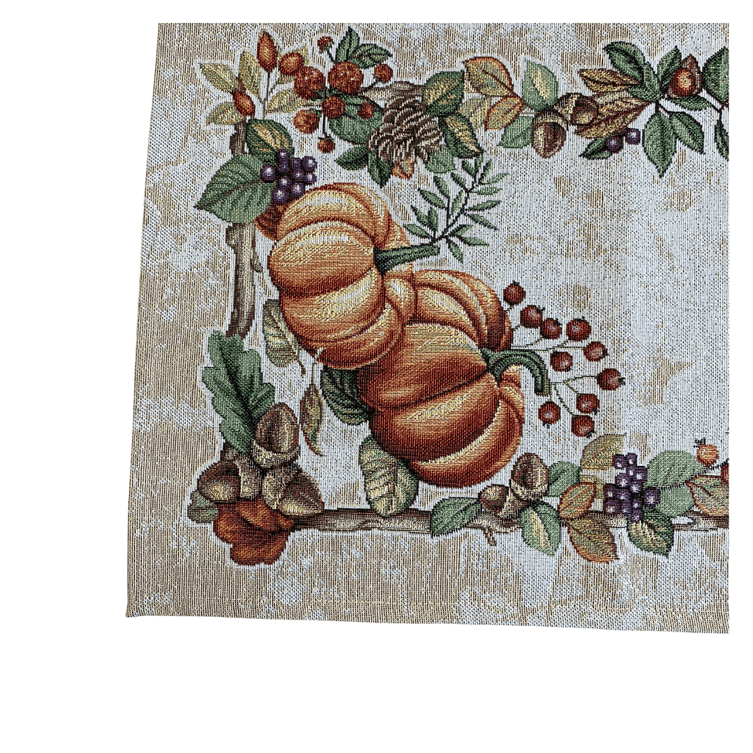 Breng de warmte en kleuren van het najaar naar je eettafel met deze prachtige herfst tafelloper van gobelinstof. Met een elegante crèmekleurige basis en een rijk patroon van pompoenen, dennenappels, eikels en herfstbladeren in warme tinten is deze tafelloper dé sfeermaker tijdens gezellige etentjes, brunches of een kop thee op een frisse herfstdag.
