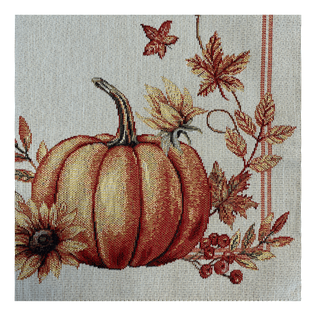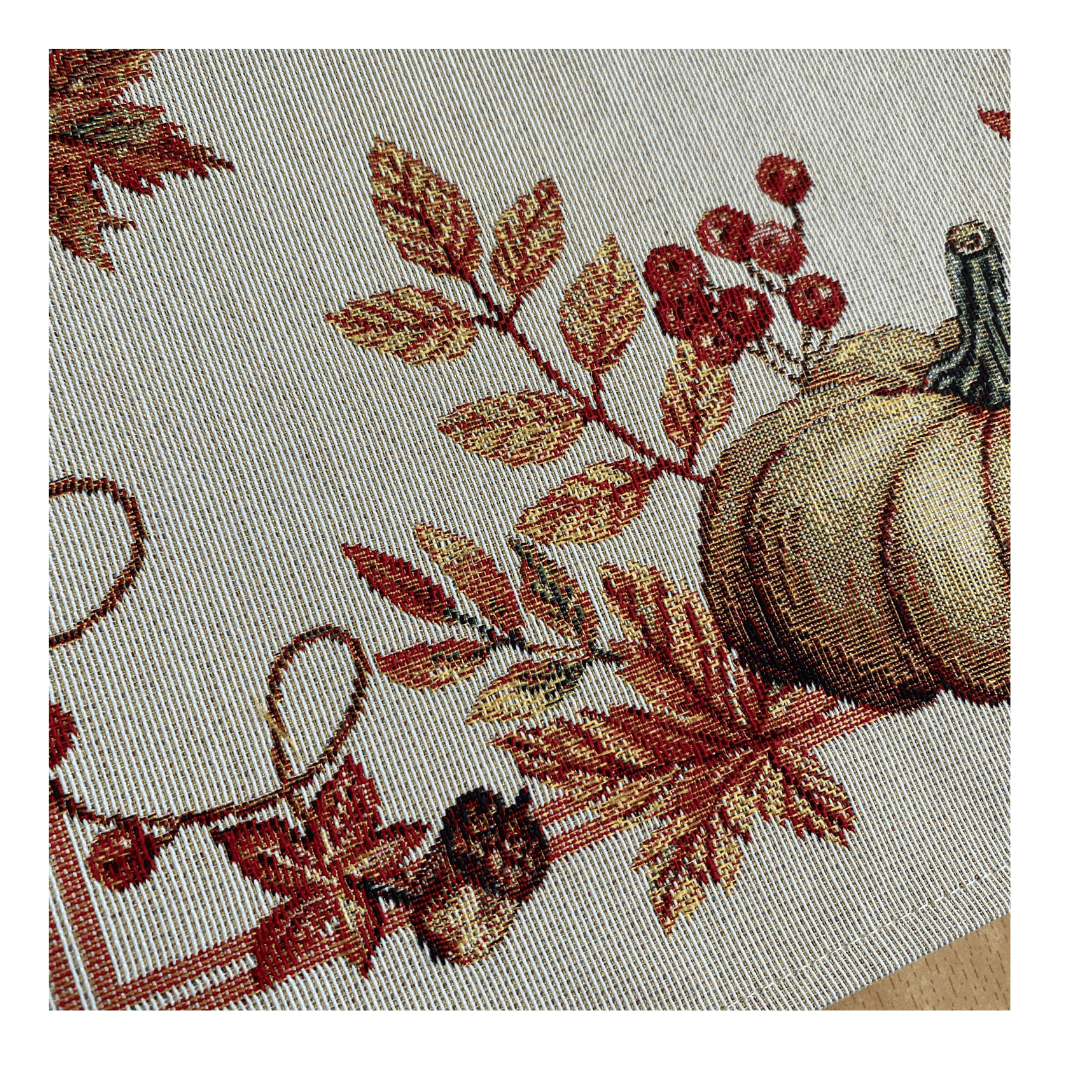 Breng de warmte en kleuren van het najaar naar je eettafel met deze prachtige herfst tafelloper van gobelinstof. Met een elegante crèmekleurige basis en een rijk patroon van pompoenen, herfstbladeren en een oranje rand in warme tinten is deze placemat dé sfeermaker tijdens gezellige etentjes, brunches of een kop thee op een frisse herfstdag.
