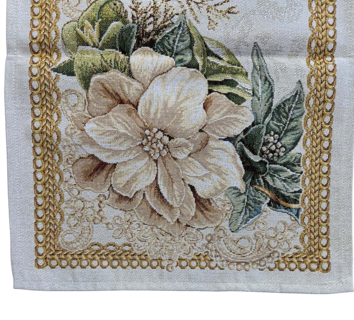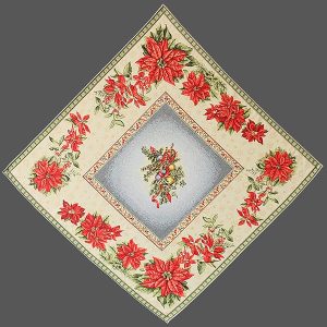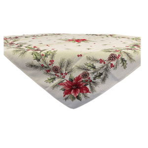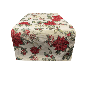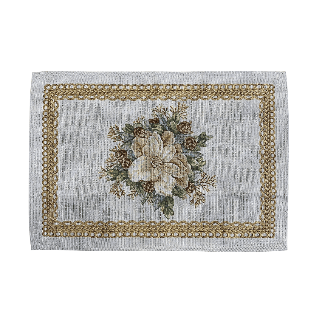 Breng de magie van kerst naar je eettafel met deze sfeervolle placemat van luxe gobelinstof. De crèmekleurige achtergrond is rijkelijk versierd met prachtige kerstrozen, een warme kaars, maretak (mistletoe) en klassieke kerstballen. Deze feestelijke combinatie zorgt voor een gezellige, stijlvolle sfeer tijdens elke kerstmaaltijd.