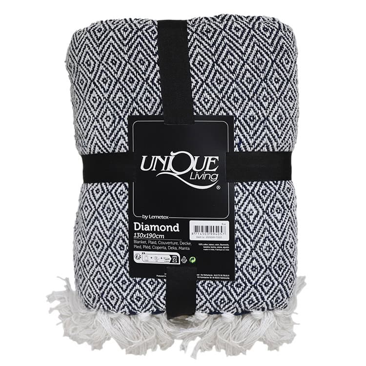 Plaid – Diamond – Donker Blauw – Wit – met tassels – 130 x 190 cm