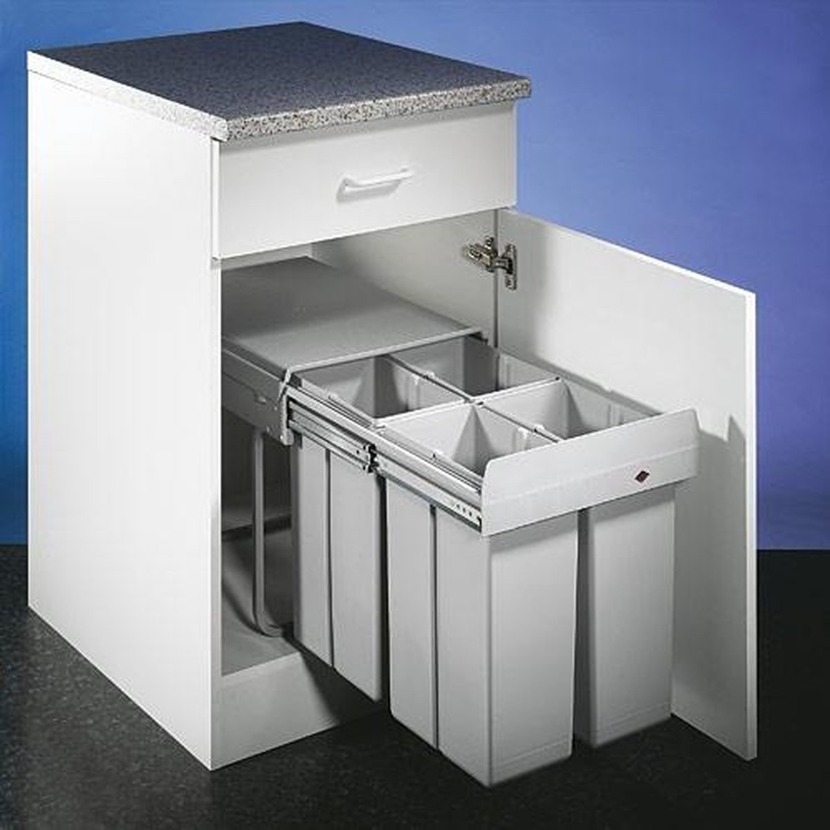 Wesco Afvalsysteem , Inhoud: 40 liter (4 x 10 liter) afvalemmer. Inbouw vanaf kastbreedte 400 mm. Afmetingen: 338mm breedte x 475mm diepte x 385mm hoogte. Voluittrekbaar systeem.