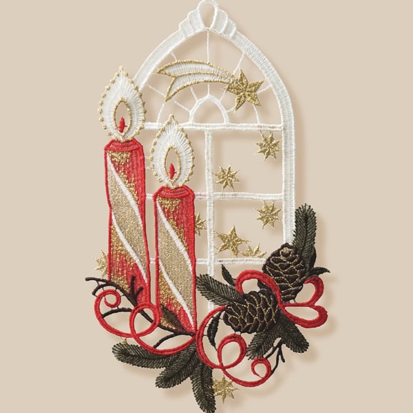 Raamdecoratie – Raamhanger – Kerst – 5 – Rode kaarsen met dennenappels – met gratis zuignap