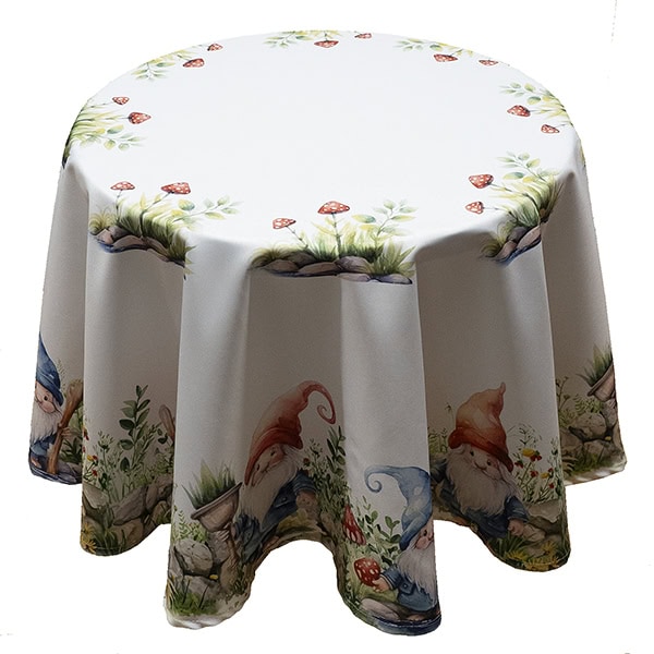 Breng een vleugje sprookjesachtige gezelligheid in huis met dit ronde tafelkleed met kabouters, paddenstoelen en bloemen. De speelse lenteprint op een frisse witte achtergrond zorgt direct voor een vrolijke en sfeervolle uitstraling aan uw eettafel. Perfect voor het voorjaar, Pasen, gezellige familiediners of gewoon om elke dag wat extra kleur toe te voegen aan uw interieur.