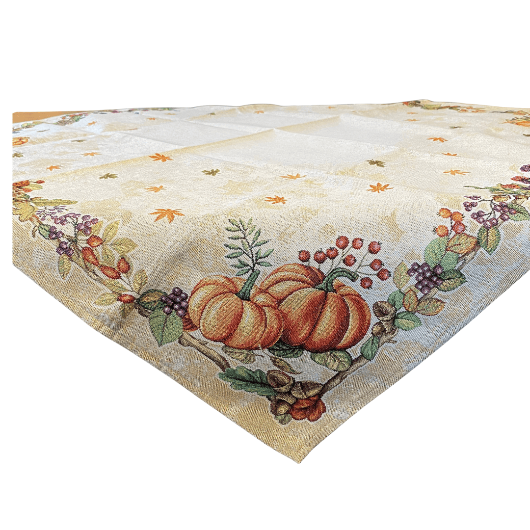 Tafelkleed – Herfst – Gobelinstof – Beige ondergrond met pompoenen – eikels – dennenappels – besjes – gekleurde blaadjes – 100 x 100 cm