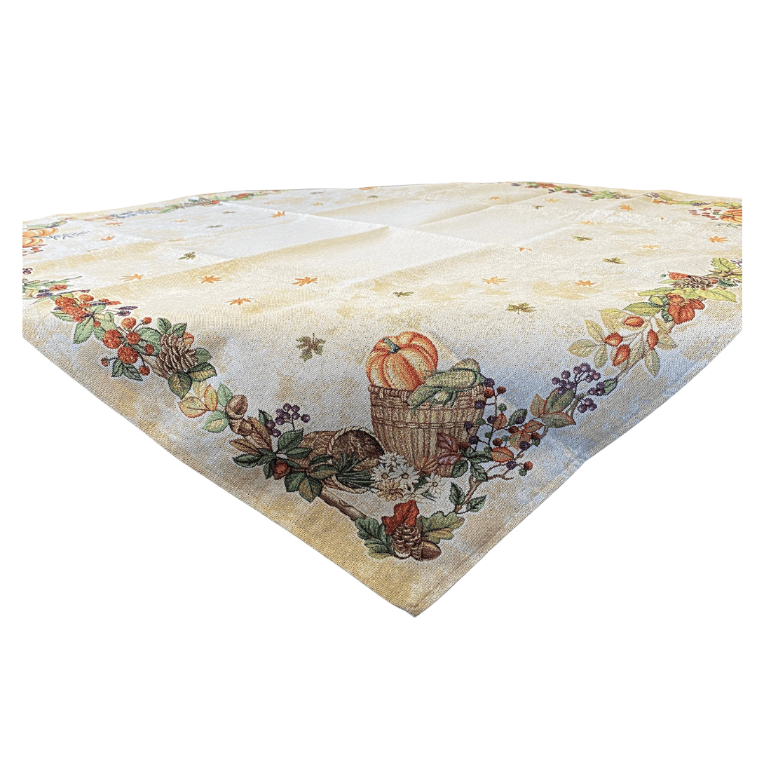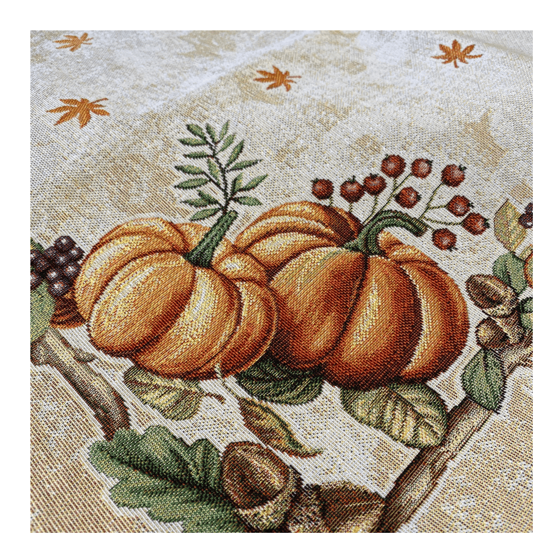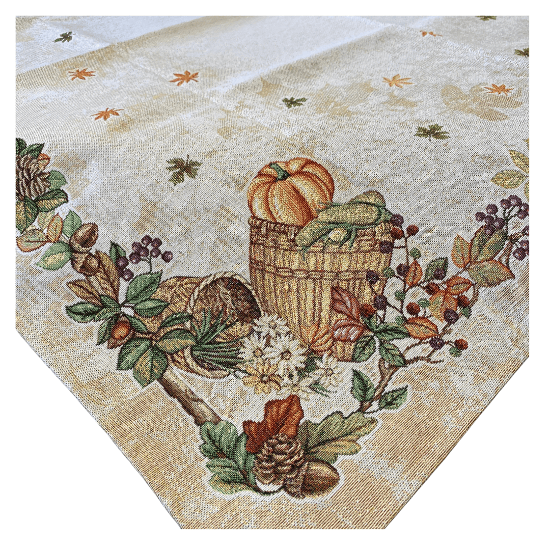 Breng de warmte en kleuren van het najaar naar je eettafel met dit prachtige herfst tafelkleed van gobelinstof. Met een elegante crèmekleurige basis en een rijk patroon van pompoenen, dennenappels, eikels en herfstbladeren in warme tinten is dit tafelkleed dé sfeermaker tijdens gezellige etentjes, brunches of een kop thee op een frisse herfstdag.