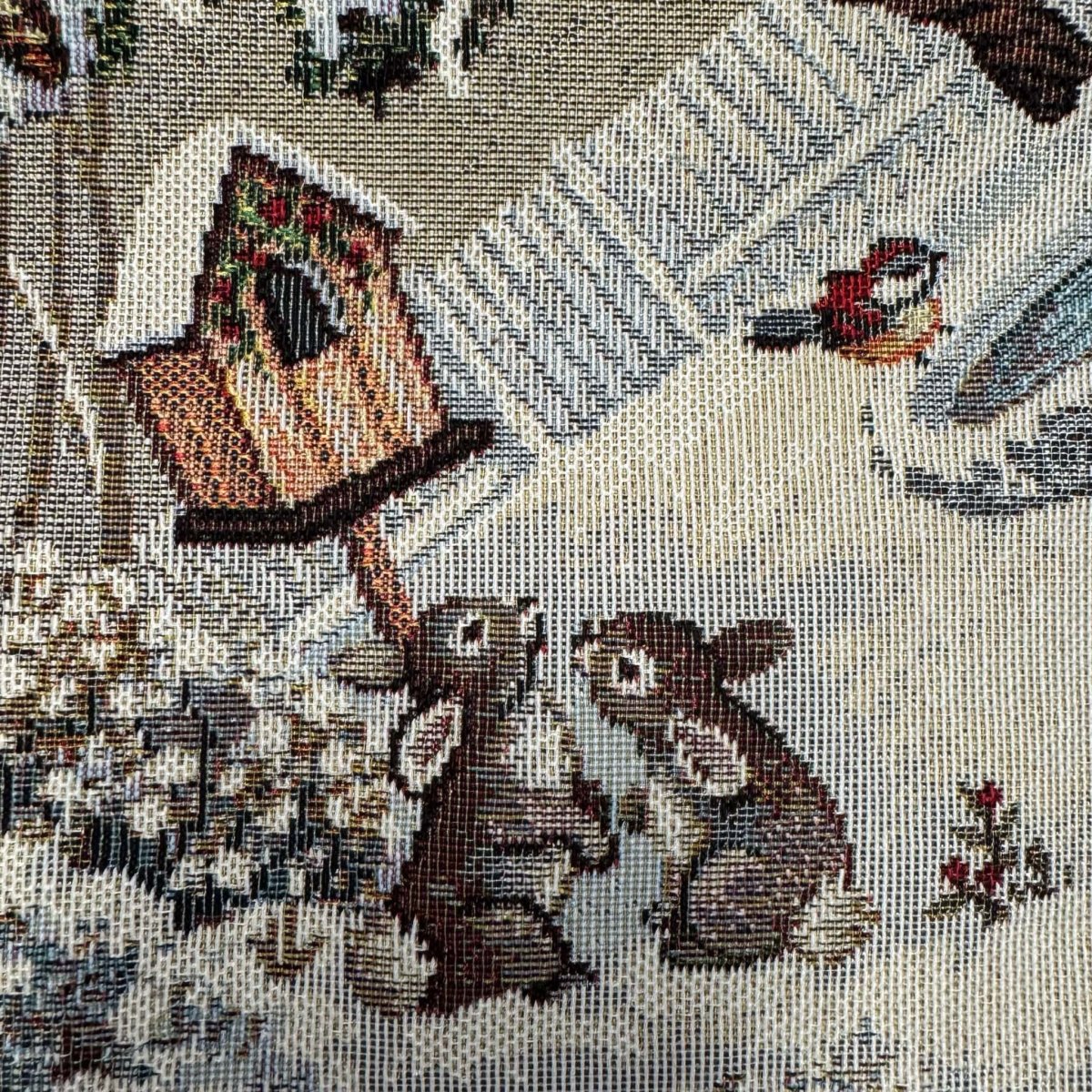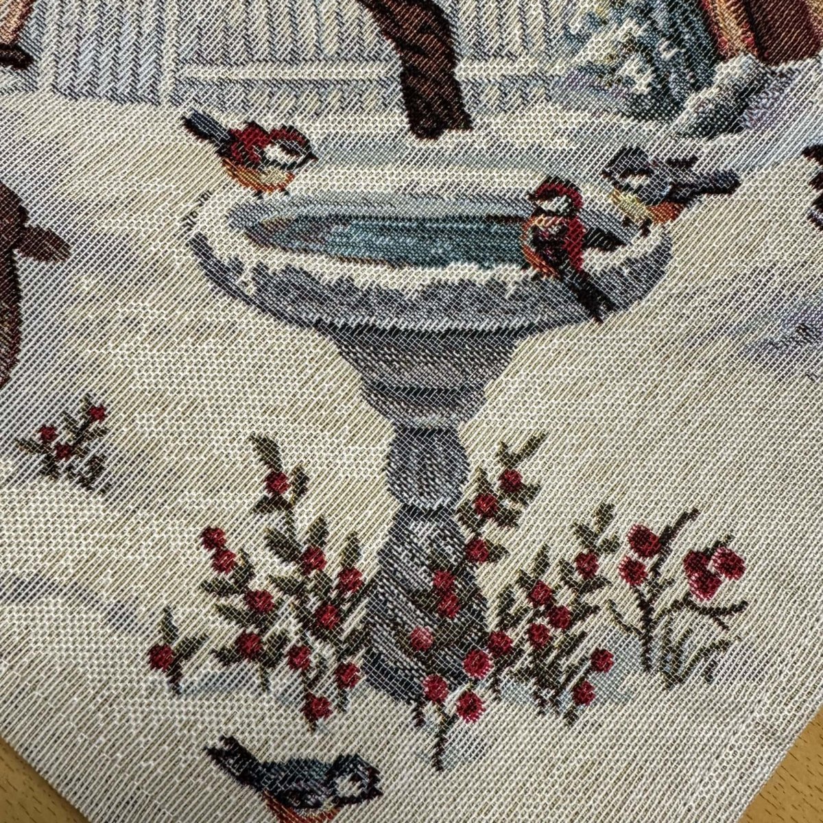 Tafelkleed – Kerst – Gobelinstof – Grijs met rode en grijze sneeuwsterren – Hertje – Vos – Eekhoorn – konijntje – Vogelhuisje – 100 x 100 cm
