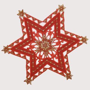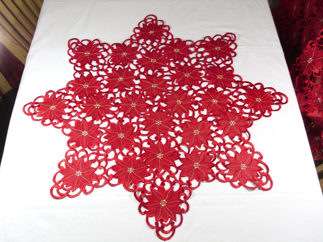 Tafelkleed – Kerst – Rood – opengewerkt met bloemen – Kerstroos – Bloemen – Ster 85 cm