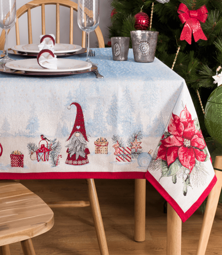 Tafelkleed – luxe gobelinstof – Kerst – Christmas Village – Gnoom – Kabouter – Vierkant 100 x 100 cm