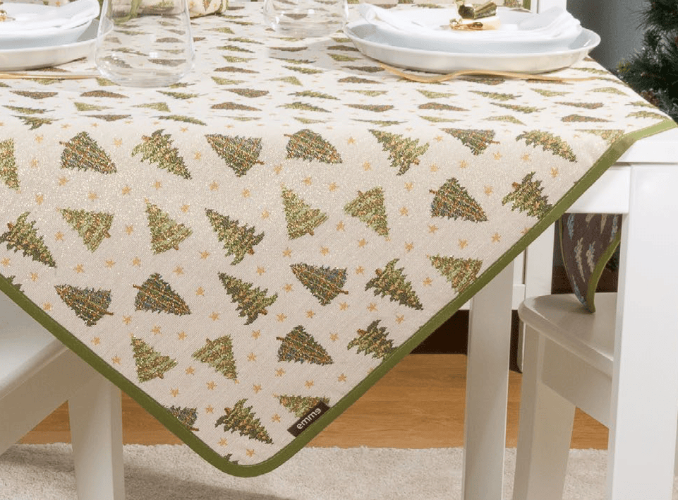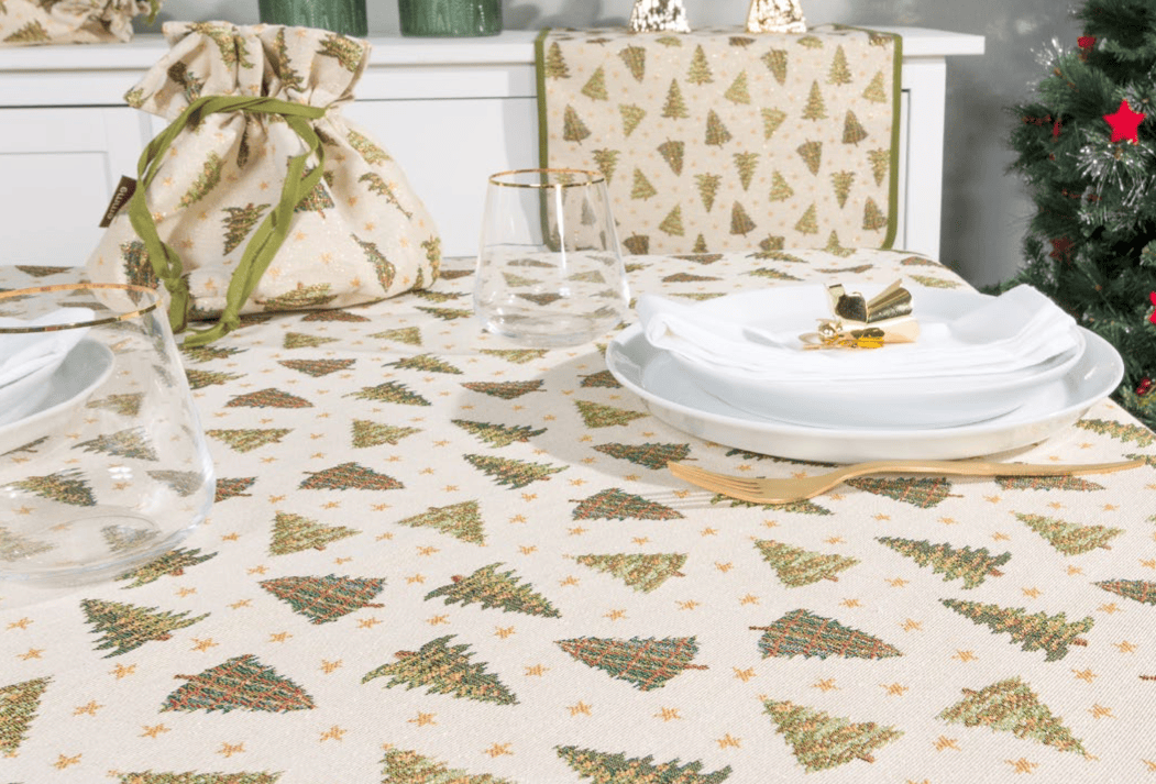 Tafelkleed – Luxe gobelinstof – Kerstbomen – Tree – All Over – Kerst – Goud glitterdraad – Rechthoek 220 x 140 cm