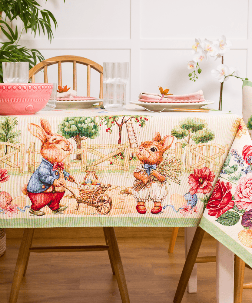 Tafelkleed – Luxe Gobelinstof – Pasen – Creme – Paashazen – Paaseitjes – groen rand – Vierkant 100 x 100 cm