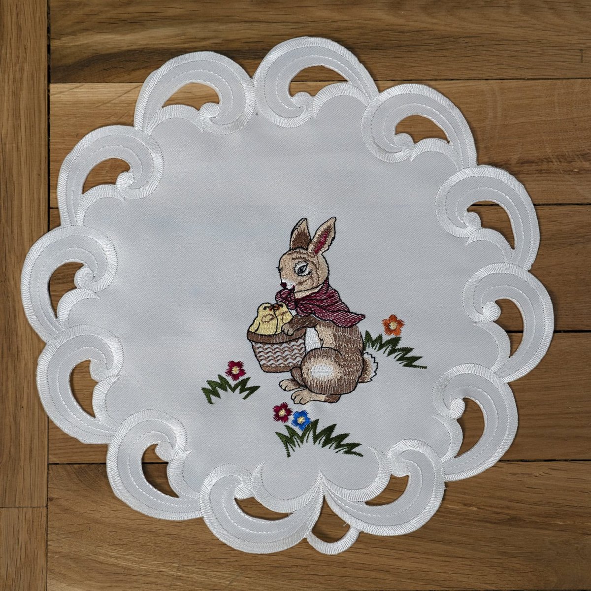 Tafelkleed – Pasen – Satijnlook- Creme kleurig met konijnen, mand, gieter en eieren – Rond 30 cm