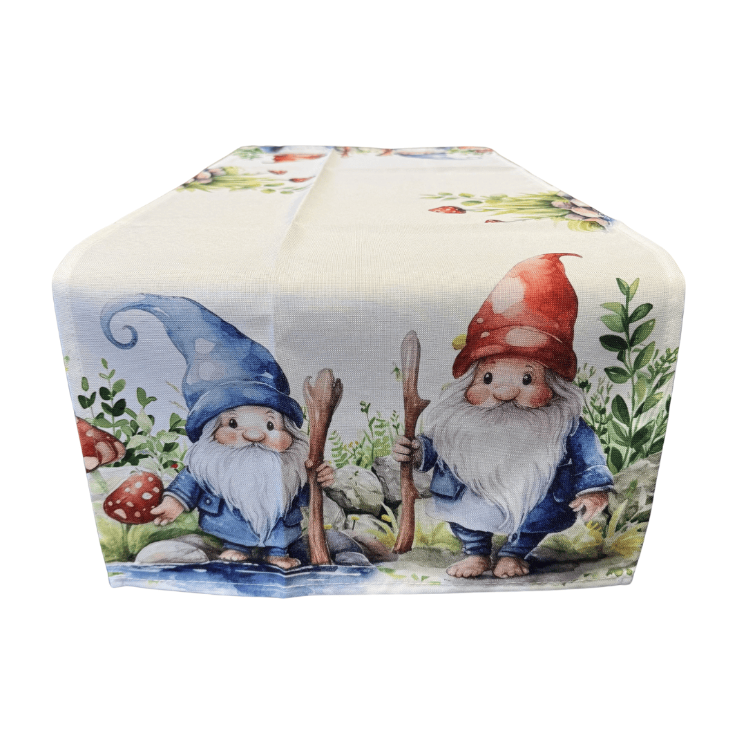 Een vrolijke tafelloper met kabouters en paddenstoelen die elke tafel een gezellige en speelse lentesfeer geeft 🍄🌿