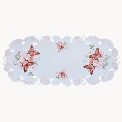 Dit lopertje heeft een geborduurde vlinder. Mooi vrolijk kleedje met een mooi afgewerkte rand.