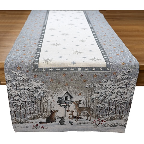 Breng warmte en charme aan je wintertafel met dit prachtige kersttafelkleed van luxe gobelinstof. Het kleed heeft een stijlvolle grijze ondergrond, versierd met sierlijke rode en grijze sneeuwsterren. De winterse sfeer wordt compleet met lieve illustraties van een hertje, vos, eekhoorn, konijntje en een vogelhuisje – een feestelijk tafereel voor jong en oud.