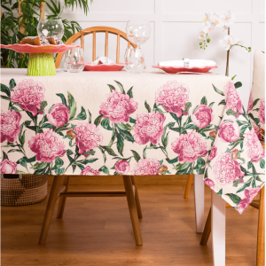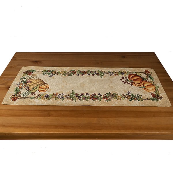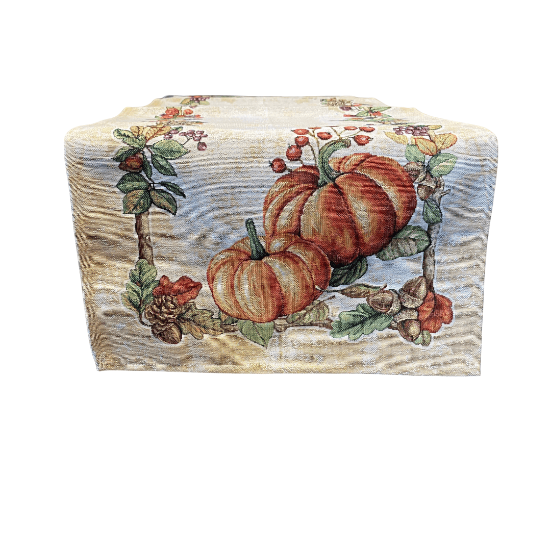 Breng de warmte en kleuren van het najaar naar je eettafel met deze prachtige herfst tafelloper van gobelinstof. Met een elegante crèmekleurige basis en een rijk patroon van pompoenen, dennenappels, eikels en herfstbladeren in warme tinten is deze tafelloper dé sfeermaker tijdens gezellige etentjes, brunches of een kop thee op een frisse herfstdag.