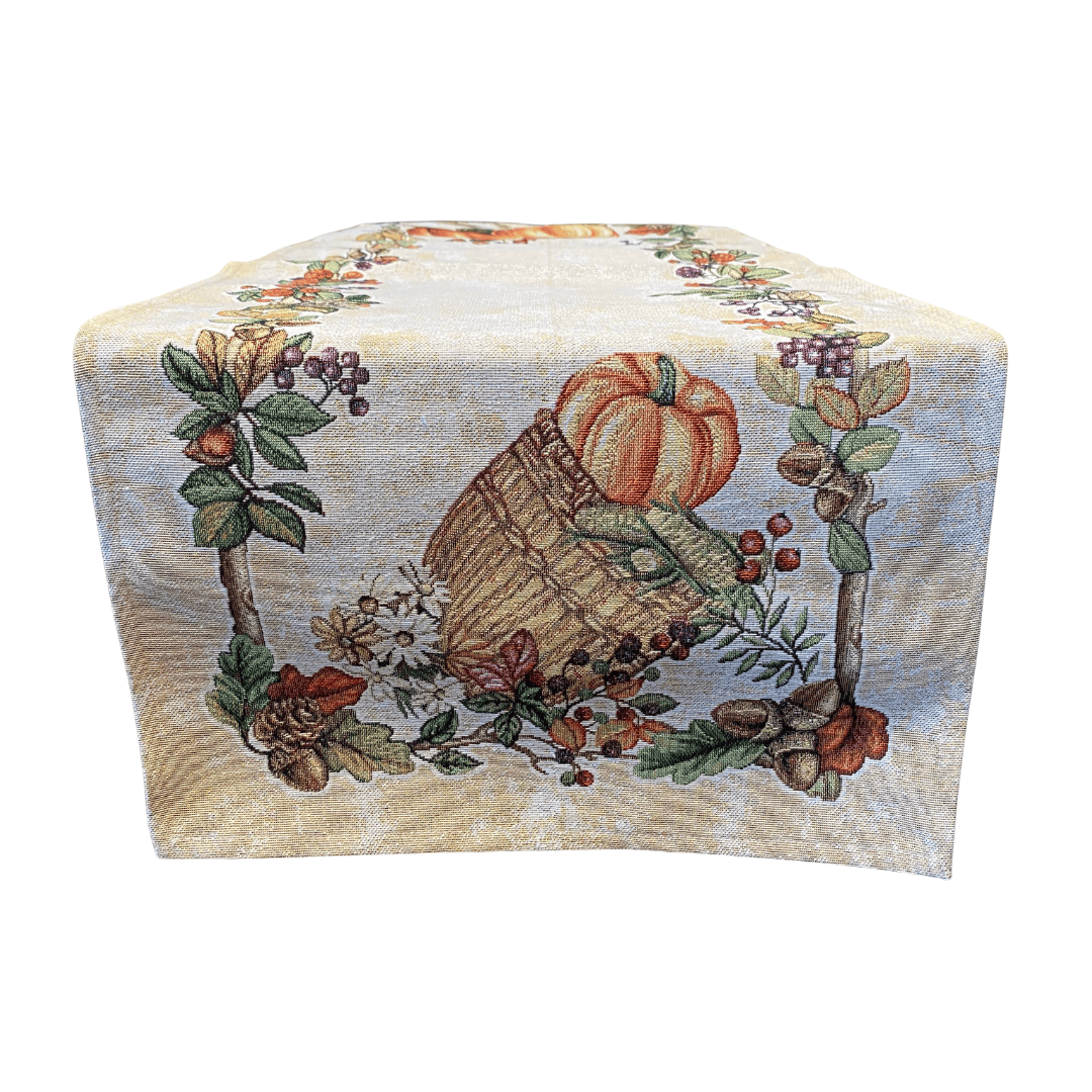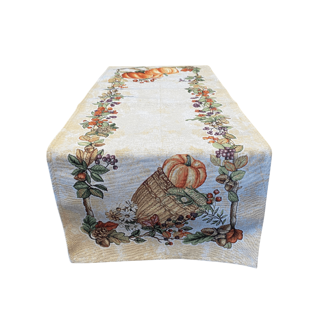 Breng de warmte en kleuren van het najaar naar je eettafel met deze prachtige herfst tafelloper van gobelinstof. Met een elegante crèmekleurige basis en een rijk patroon van pompoenen, dennenappels, eikels en herfstbladeren in warme tinten is deze tafelloper dé sfeermaker tijdens gezellige etentjes, brunches of een kop thee op een frisse herfstdag.