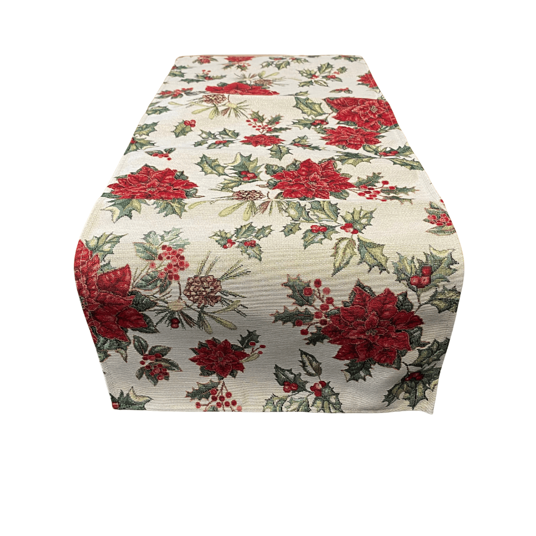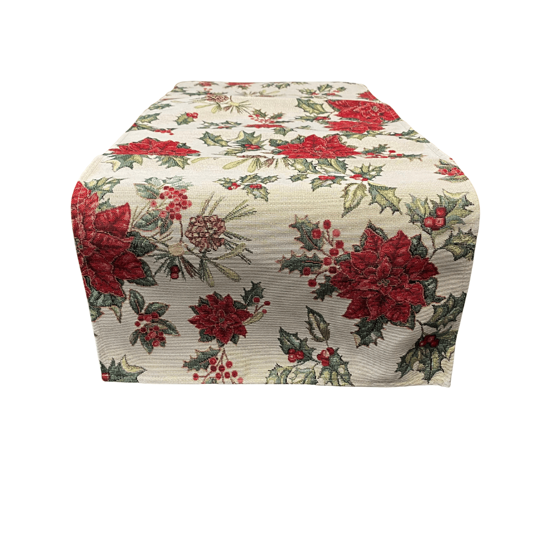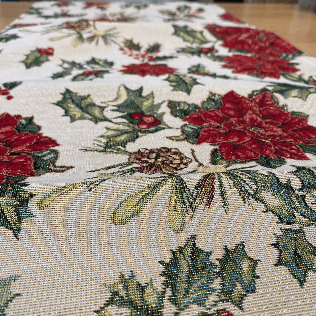 🎄 Tafelloper Bea – Kerst – Gobelinstof – Dennenappels, Kerstroos & Hulst – Met Goudglitterdraad – 100 x 35 cm