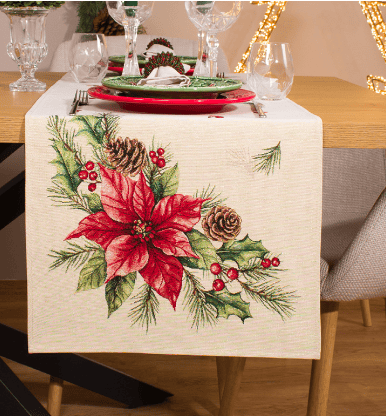 Breng de warmte van kerst in huis met deze stijlvolle tafelloper “Mary”, uitgevoerd in rijke gobelinstof. De sfeervolle print met dennenappels en kerstroos in warme tinten zorgt direct voor een feestelijke tafelsetting. Ideaal voor gebruik tijdens het kerstdiner, op een dressoir of als decoratief accent op de salontafel.