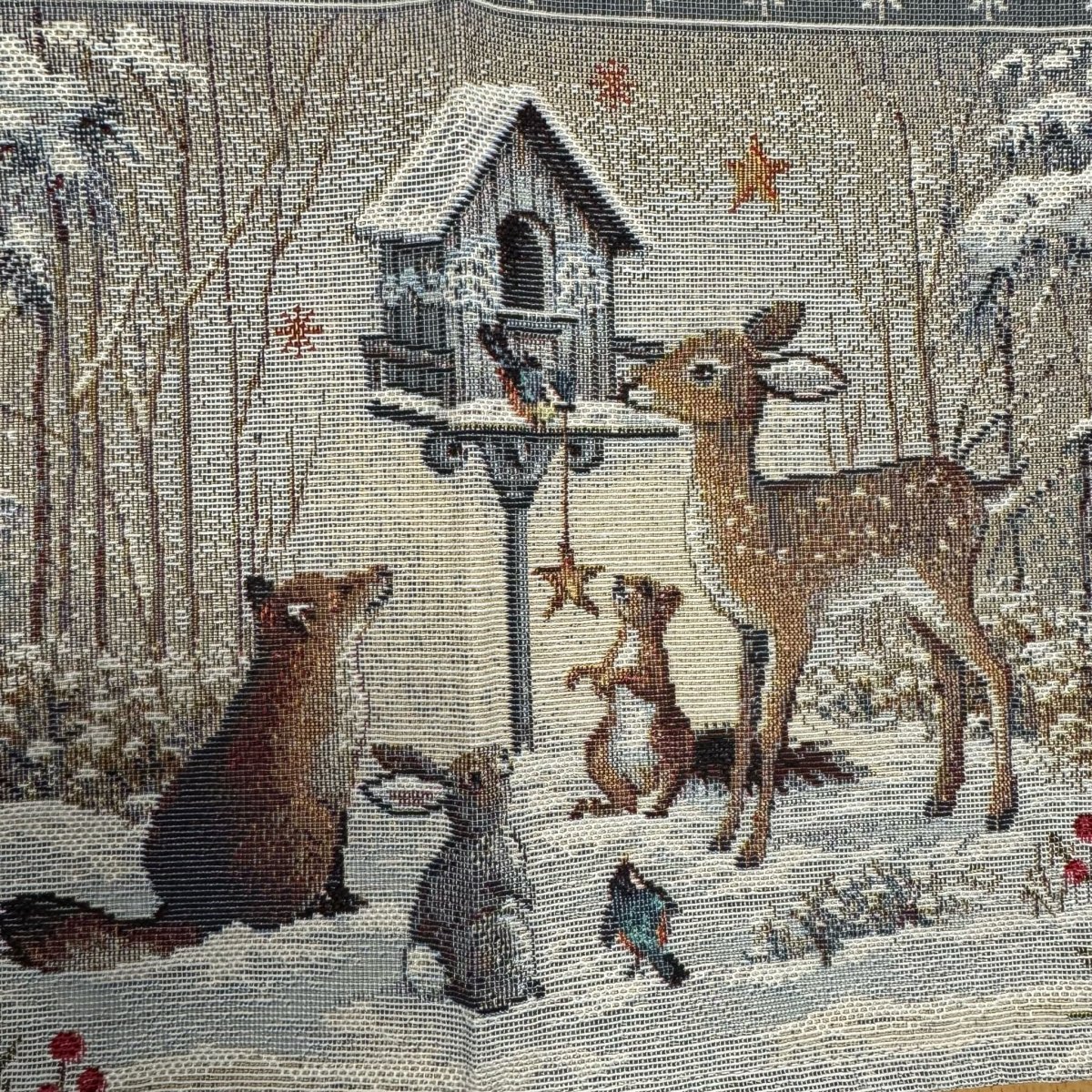 Kerst – Wintertafelloper – Gobelinstof – Grijs met rode en grijze sneeuwsterren – Hertje – Vos – Eekhoorn – konijntje – Vogelhuisje – 35 x 100 cm