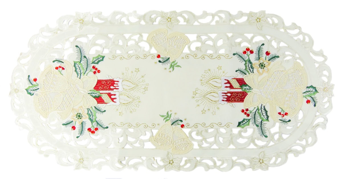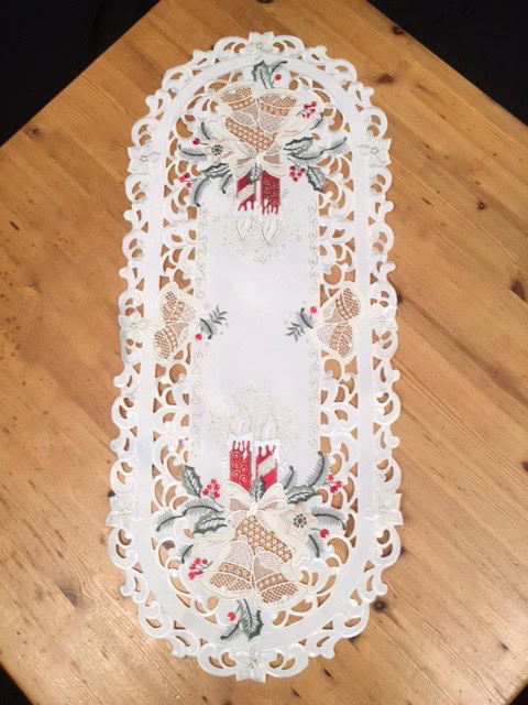 Tafelloper- Linnenlook – Kerst – Crèmekleur met rode kaars – Kaarsen en Bellen – Loper 70 cm