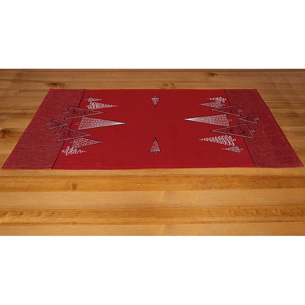 Breng een stijlvolle kerstsfeer op tafel met deze elegante tafelloper in linnenlook. De rode ondergrond vormt een chique basis voor het patroon van moderne, strak vormgegeven kerstbomen in donker rood- en zilverkleurige accenten. Subtiel glanzend, tijdloos en perfect voor een eigentijdse kersttafel.