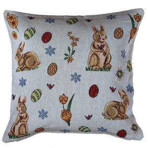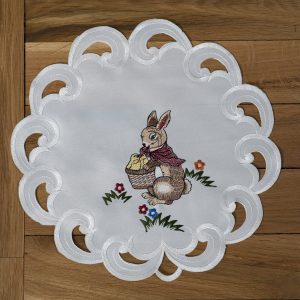 Mooie tafelloper versiert met een Paashaas en gele bloem. Gezellig om de tafel mee te dekken tijden pasen.