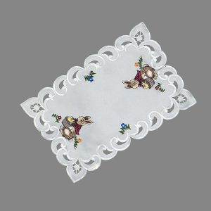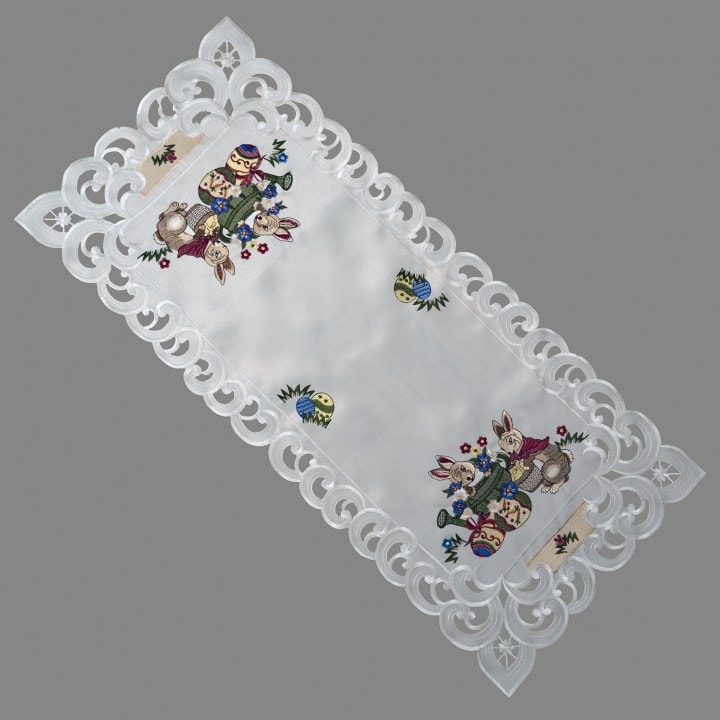 Tafelloper – Pasen – Satijnlook- Creme kleurig met konijnen, mand, gieter en eieren – 35 x 70 cm