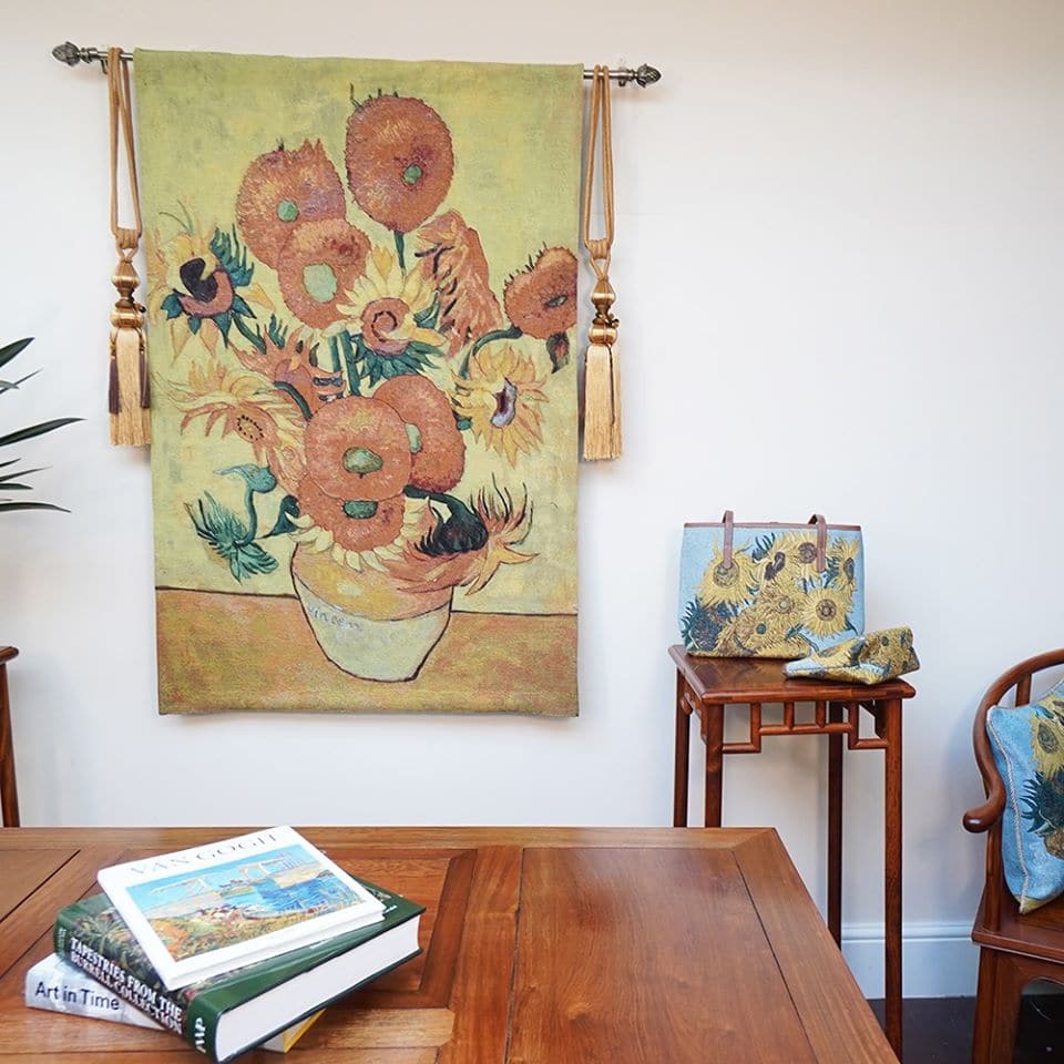 Een wandtapijt voor huisdecoratie met Van Goghs kenmerkende zonnebloem schilderij. Geschilderd in augustus 1888 in Arles, Frankrijk, het was een van de vele soortgelijke werken die Van Gogh tijdens zijn leven schilderde en de kenmerkende postimpressionistische stijl van de kunstenaar demonstreert. Dit Franse wandtapijt is gevoerd en heeft een tunnel om makkelijk aan de muur te hangen. British Art and Crafts Movement.