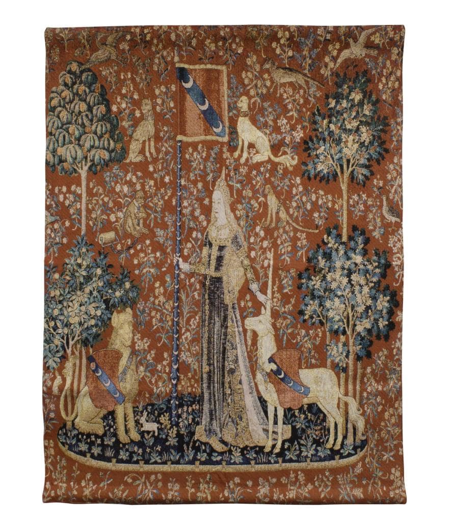 De Dame en de Eenhoorn, La Dame à la licorne in het Frans, is een serie van zes wandtapijten ontworpen in Parijs en geweven in Vlaanderen rond 1500 n.Chr., Allemaal bestaande uit een dame geflankeerd door een leeuw en een eenhoorn in verschillende scènes. In Sense of Touch houdt de Vrouwe zelf de banier vast en raakt ze met haar andere hand de hoorn van de eenhoorn aan terwijl de leeuw toekijkt. De enige andere figuren zijn verschillende kleine dieren op de achtergrond. Millefleur Design.
